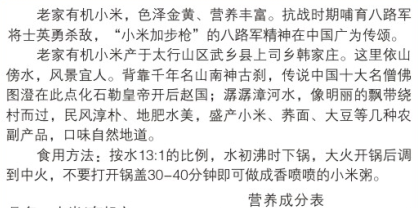 郑州纸箱厂加工小米纸箱包装选用精品进口牛卡纸,对表模切,做工精细,外观大方,考家有机小米.色澤金量、营集率·.抗战时期購言八路章将士英·果款米加步能-的八路军精神在中国广为传類,,考家有机小米产于太行山区成·县上司乡韩家庄意里使山像水风最宜人,背t千年名山商神古·l,传11i中国十大名·体图癌在此点化石動0帝开后名国l 931i河水.像明蘭的n常集村而过.民风違l十、地配水美.盛产小米、养面、大豆等几种表·1产品口味白然地遭.食用方法 接水131的比例,水初沸时下領.大火开報后f 到·火.不要t'开報量3o-4o分軸即可做成番质喊的小米常.营养成分表品名:小米l有机1 原料:谷子(有机1 产地:山西·长治质·等组: 一组产品类型程性小米事含量: m克营养成分表方法:存放在干爆選光处 郑州纸箱厂生产日期:见封口保质期: 12个月 生产许可证号: 0S140401040196 执行标准: Gf766 要o 制造商武乡县老家表业开发有限公司 地址,山西武多县上司乡韩庄村 -有机食品是指在生产加工过程中'不使用任何人工合成的化肥、农药和添加剂,并通过有美频证组织监测'确认为纯天然、无污染、安全营养的食品,也可称为一生态食品一。 郑州纸箱厂专业加工纸箱包装联系电话13071031976 郑州纸箱厂www.hnjmbz.com